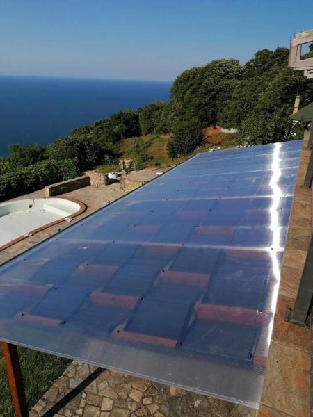 - Πλέξιγκλας οροφή: Το πλέξιγκλας χρησιμοποιήθηκε για την κατασκευή της οροφής, προσφέροντας προστασία από τη βροχή και τον άνεμο, ενώ παράλληλα επιτρέπει στο φυσικό φως να εισέρχεται στον χώρο.