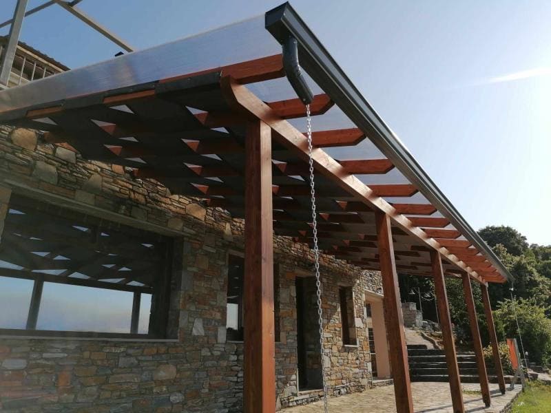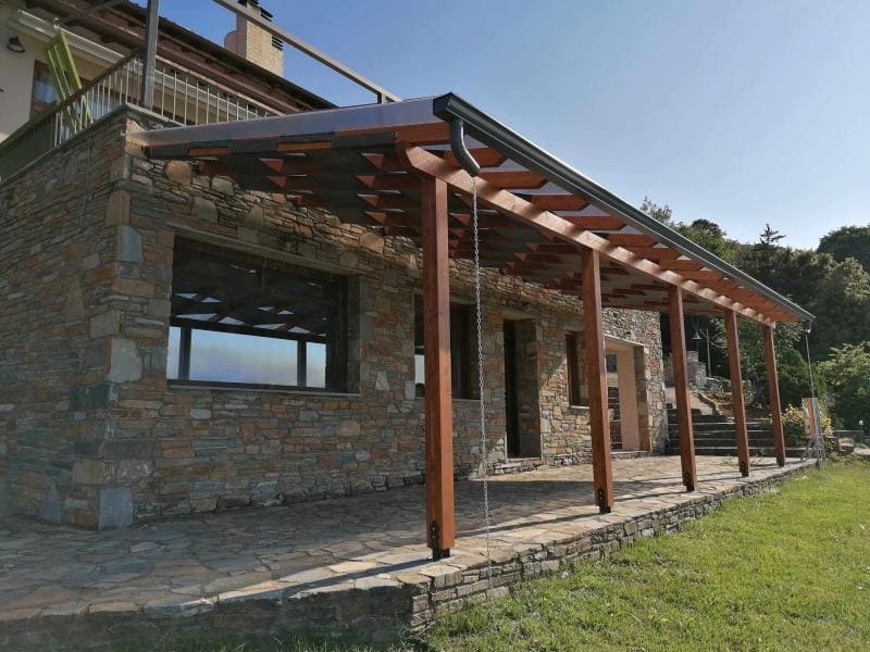 - Ξύλινη κατασκευή: Επιλέξαμε ξύλο υψηλής ποιότητας για την κατασκευή της πέργκολας, προσδίδοντας μια φυσική και ζεστή αίσθηση απόλυτα συνδεδεμένο με το πέτρινο κτίριο.